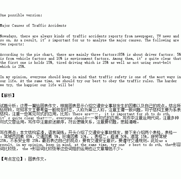 请根据以下交通事故因素(factors)统计图表,以“Major causes of traffic accidents” 为题,用英语写一篇简短的分析报告,向学校英语报投 稿。
