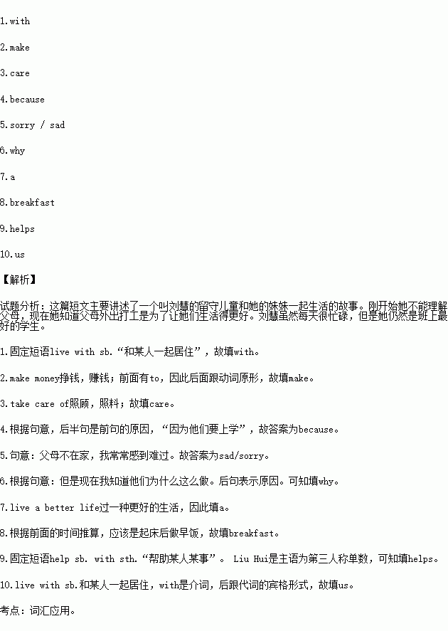 She is Liu Hui, a middle school student in Anhui, one of the “ stay at home children” in her town. Liu Hui is 12 years old and lives1.____ her sister. Her parents left home to 2._____ money in big cities when she was only four. Liu Hui has to take 3.______ of her younger sister. They have to stay at home alone 4._____ they have to go to school in the town.