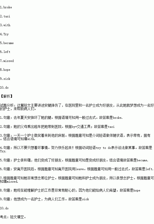 One day a nurse came to Ann's bed and said 3. a smiles(微笑),“You'll be better soon. You can walk again. So don't think only about bad things. 4. to be happy!”The nurse was very kind and they 5. friends.