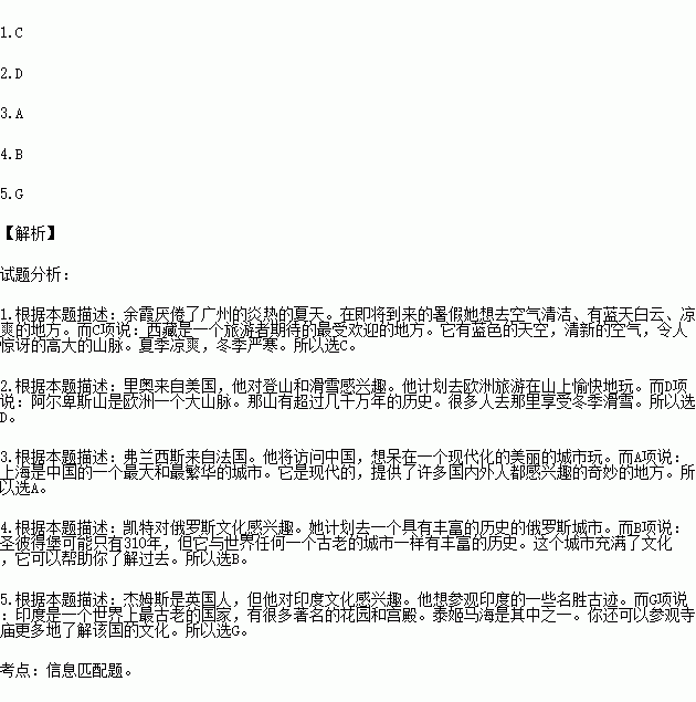 1. Yu Xia is tired of the hot summer days in Guangzhou. She wants to visit somewhere cool with clean air and blue sky in China in the coming summer holiday. 2. Leo is from the USA and he is interested in climbing and skiing. He plans to travel to Europe and have a good time in the mountains. 3. Francis in from France. He is going to visit China and wants to stay in a modern and wonderful city for fun. 4. Kate is interested in Russian culture. She is planning to visit a city in Russian which has a rich history. 5.James is an English man but he is interested in Indian culture. He wants to visit some places of interest in India. | A. Shanghai is one of the biggest and busiest cities in China. It is modern and offers many wonderful places of interest to people at home and abroad to enjoy themselves. B. St. Petersburg may be only 310 years old, but it has a history as rich as any ancient city in the world. This Russian city is full of culture, which can help you understand its past. C. Tibet is one of the most popular places that tourists look forward to going to. It offers blue sky, clean air and amazingly tall mountains. The weather is cool in summer and cold in winter. D. The Alps is one of the great mountains in Europe. The mountains were there over tens of millions of years ago. Many people go there to enjoyskiing in winter. E. Maldives is a country of islands in South Asian. Its beaches are among the most beautiful ones in the world. It’s really a fantastic place to spend your holiday. F. Paris is the capital of France. It has a long history and has many well-known places of interest. People consider it as a city of romance(浪漫). G. India, one of the most ancient countries in the world, has many famous gardens and palace. Taj Mahai is one of them. You can also visit the temples(庙宇)to know more about the country’s culture. |