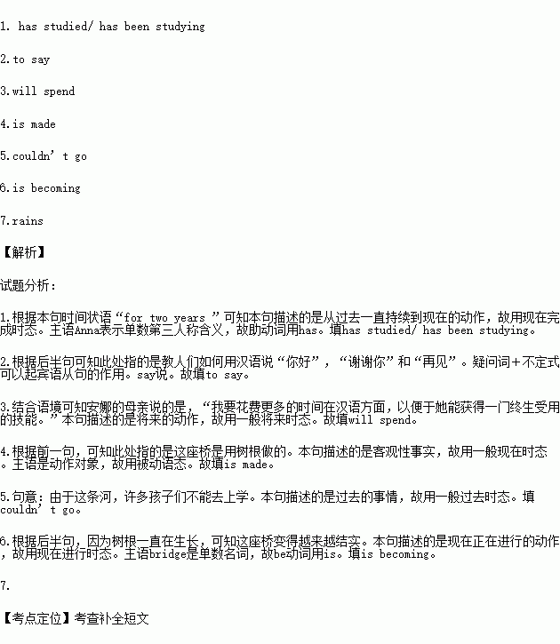 Pakih Sohan, a teacher, began to build the bridge in 1890. Because of the river, many children 5. (not, go) to school. It took Pakih Sohan more than 26 years to make the strong bridge. The bridge 6. (become) stronger and stronger because the roots grow all the time.