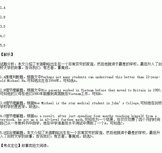 Michael Ha was born in a very poor family. His parents worked in Vietnam before they moved to Britain in 1980. They couldn’t find work in Britain because they spoke little English. The whole family had to live on benefits(救济金) and they lived in a small house in Hackney, a poor area in East London. Growing up is not easy for Michael, but he never gave up.