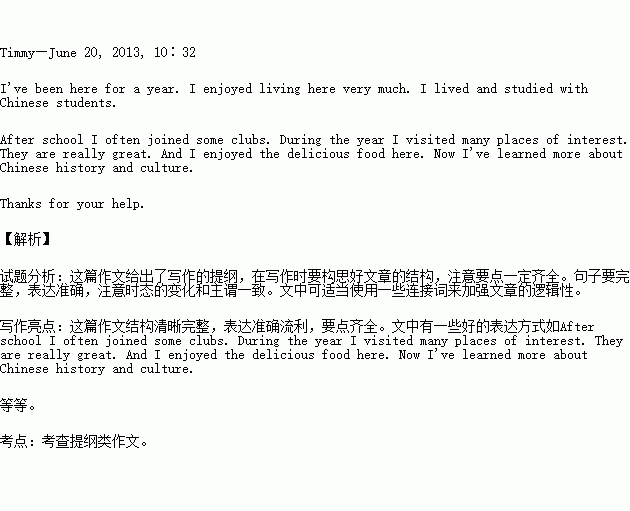 Ò»ÄêǰTimmy×÷ΪһÃû½»»»ÉúÀ´µ½±±¾©²Î¼ÓÁË¡°ÌåÑéÖйú¡±µÄ»î¶¯¡£ÔÚѧϰÆÚÂú¼´½«»Øµ½Ó¢¹úÖ®¼Ê£¬ËûÔÚÐ£Ô°ÍøµÄÁôÑÔ°åÉÏдÏÂ×Ô¼ºÔÚÕâÀïѧϰºÍÉú»îµÄÇé¿öºÍ¸ÐÊÜ¡£Çë¸ù¾ÝËù¸øÌáʾ£¬°ïÖúTimmyÍê³ÉÕâÔòÁôÑÔ¡££¨60´Ê×óÓÒ£©