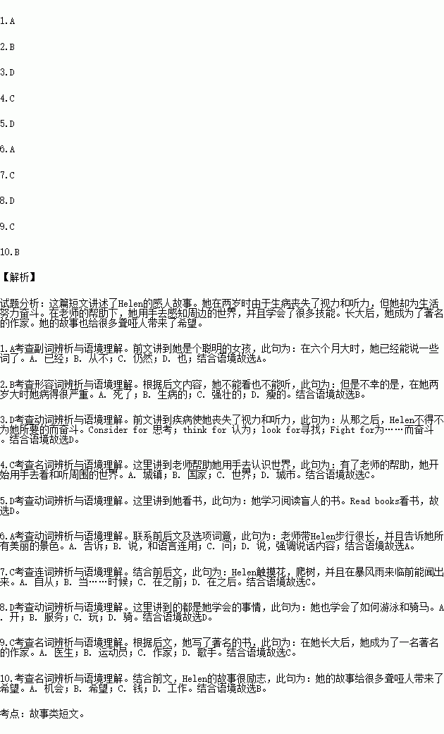Helen Keller was a very bright, beautiful girl. At the age of six months she could say a few words. But unluckily, before she was two years old, she was badly . After that, she could not see or hear, and soon she could not even talk. Since then Helen had to for what she wanted. When she was six, her parents invited a teacher for her. With the help of the teacher, she began to see and hear the around her through her hands. She learned to the books for the blind. The teacher took Helen for long walks, and her about all the beautiful sights. Helen touched flowers, climbed the trees and even smelled a rain storm it came. She also learned how to swim and a horse. After she grew up, she became a famous in America. Her first and most famous book is The Story of My Life. Her story has brought new to many blind and deaf people. It has given light to those in darkness and encouraged them to live and work.
