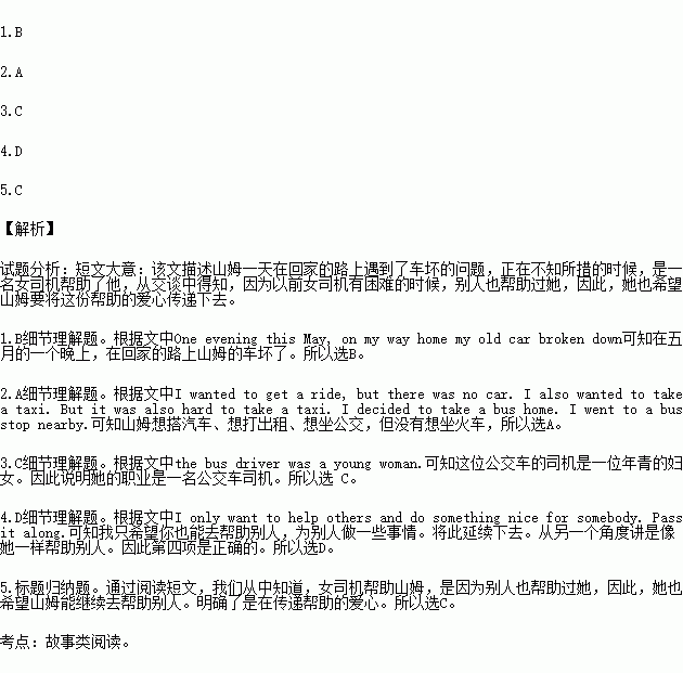 One evening this May, on my way home my old car broken down (出故障). It was 25 miles from my home. I wanted to get a ride, but there was no car. I also wanted to take a taxi. But it was also hard to take a taxi. I decided to take a bus home. I went to a bus stop nearby.