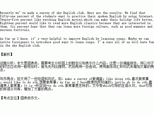 最近,学校就空中俱乐部的英语学习内容设置做了意向调查(结果见下面图表)。请你帮俱乐部用英语写一篇报告,并谈谈你自己的想法或建议。