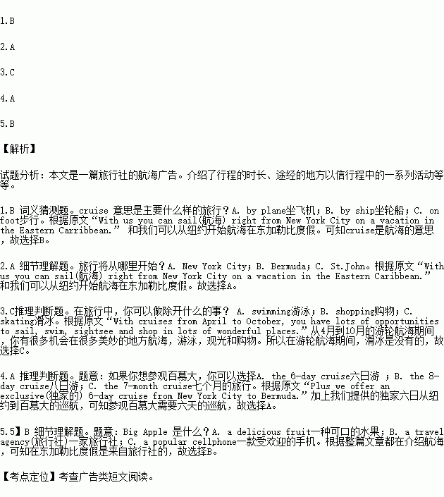 With cruises from April to October,you have lots of opportunities to sail,swim,sightsee and shop in lots of wonderful places.Plus we offer an exclusive(独家的)6-day cruise from New York City to Bermuda.Ready for an unforgettable vacation?Let the fun begin.