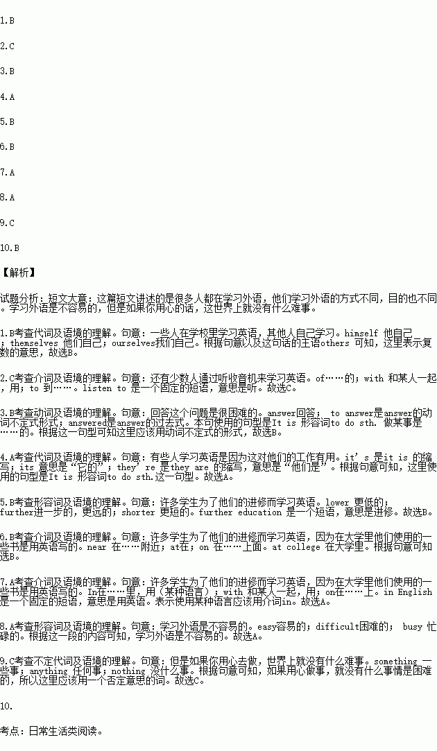 People all over the world are learning English. Some learn at school, others study by _____. A few learn English by listening ____ the radio. Why do all these people want to learn English? It's difficult ____ this question. Many children learn English at school because it is one of their subjects. Some people learn English because ______useful for their work. Many students often learn English for their______ education because _____ college some of the books they will use are written _____ English. It is not _____ to learn a foreign language. But there is _____ difficult in the world if you _____ your heart into it.