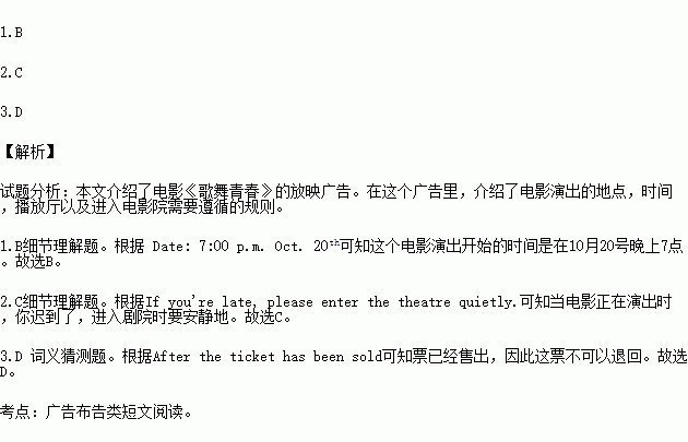High School Musical Place: Beijing Grand Theatre Date: 7:00 p.m. Oct. 20th Number: 6, Row 9, Floor 1 Price: RMB 80 ◆ Don't bring any dangerous things. ◆If you're late, please enter the theatre quietly. ◆The use of cameras and videos is not allowed. ◆Turn off your cell phones or set them to vibration mode(震动模式). ◆Please check your seat number and be seated before the play begins. ◆After the ticket has been sold, there is no refund. |