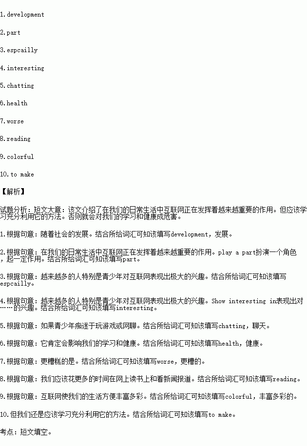 Have you ever tried shopping online? What about talking with strangers though the Internet? Of course, yes. With the1. of the society, the Internet is playing a more and more important2. in our daily life, more and more people3. _____teenagers show great4. in the Internet. If teenagers are crazy about playing games or5. online ,it will definitely have bad effect on our study and6. .What’s7. ?It may make us get tired of everything expect surfing the net. We should spend more time8. books and news report on the Internet. In a word, The Internet makes our life convenient and9. ,but we still should learn the way10. full use of it.