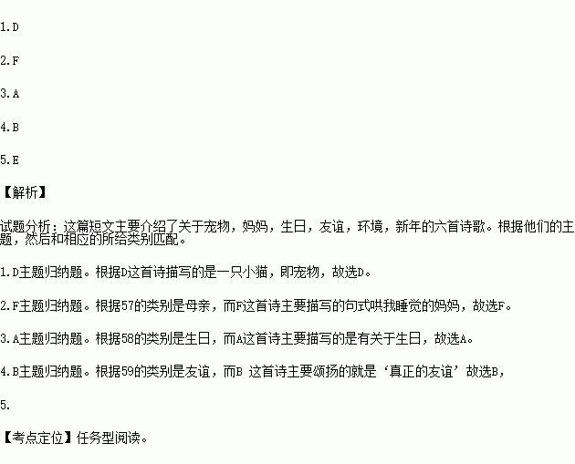 你们班级正在进行优美英文诗歌的收集活动。请仔细阅读以下A 到F 选项中六位同学收集的诗歌,在56--60题中为其归类。其中一首诗为多余选项。