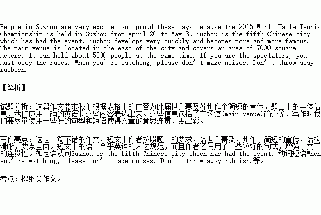 2015年的世界乒乓球锦标赛近日正在苏州举办。这是苏州的一件大事,全民重视。作为生活在苏州的一份子,请你根据以下表格中的内容为此届世乒赛及苏州作个简短的宣传。