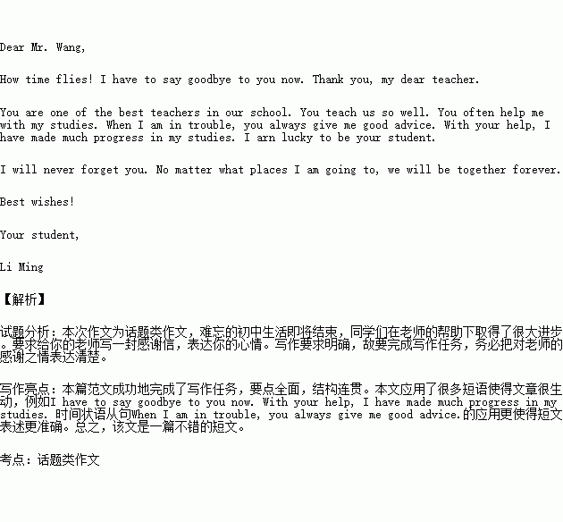 难忘的初中生活即将结束,同学们在老师的帮助下取得了很大进步。此时此刻,你一定有很多的心里话要对老师说。请给你的老师写一封感谢信,表达你的心情。(信中不准出现真实校名和姓名)