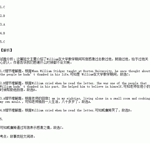 I can’t tell you how much your letter meant to me. I am in my eighties, living alone in a small room and cooking my own meals. You will be interested to know that I taught school for 50 years and yours is the first letter of appreciation(感激)I ever got. It came on a cold morning and it made me feel very warm.