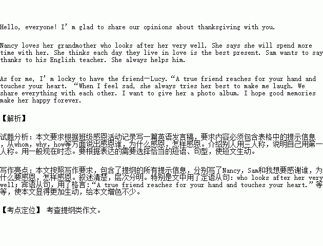 在英语课上,老师组织了以“感恩”为主题的小组交流活动,请根据活动记录写一篇英语发言稿。