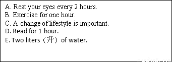 3.________ Take your eyes off the book or screen every two hours and look into the distance. The eyes can affect brain and heart functions if overused, which can lead to a risk of sudden death.