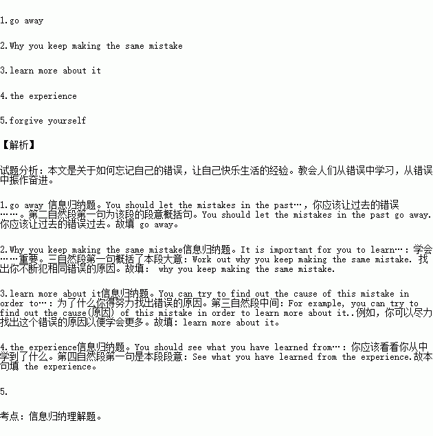 See what you have learned from the experience. After you have learned why you made the mistake, you should think about what you have learned from it. Maybe you recognize that you should have listened to your heart. Or maybe you need to forgive(原谅) yourself for a mistake that you made a few days ago.
