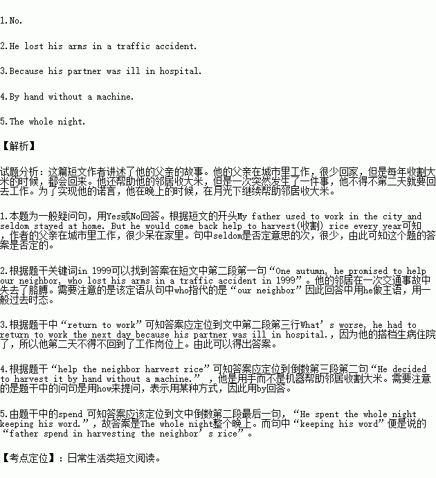My father used to work in the city and seldom stayed at home. But he would come back help to harvest(收割) rice every year.
