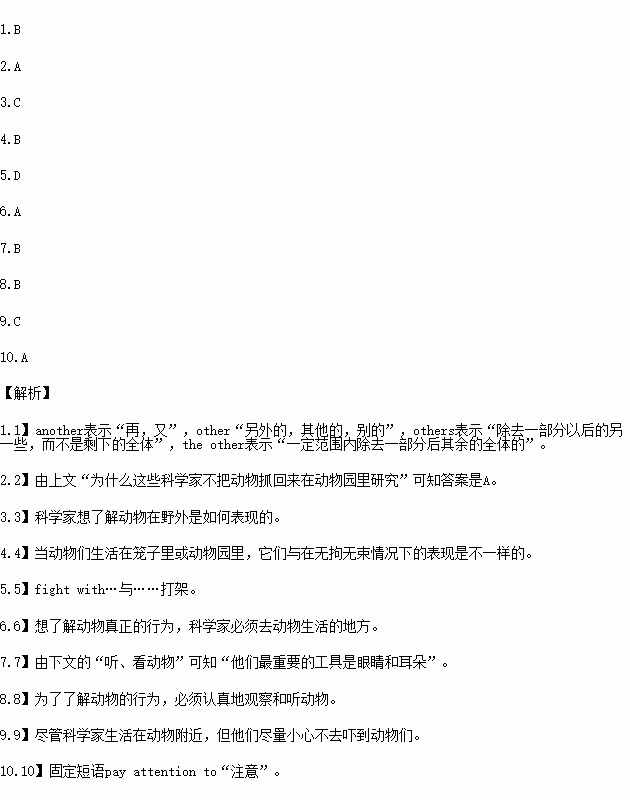 When you hear the word“scientist”.what do you think of?Many people think scientists are people in clean white coats who work in labs.And some scientists do work in labs.But there are________scientists who work in woods and jungles.These scientists are called“animal behavior(行为)scientists”,and they study animals as they live in nature.