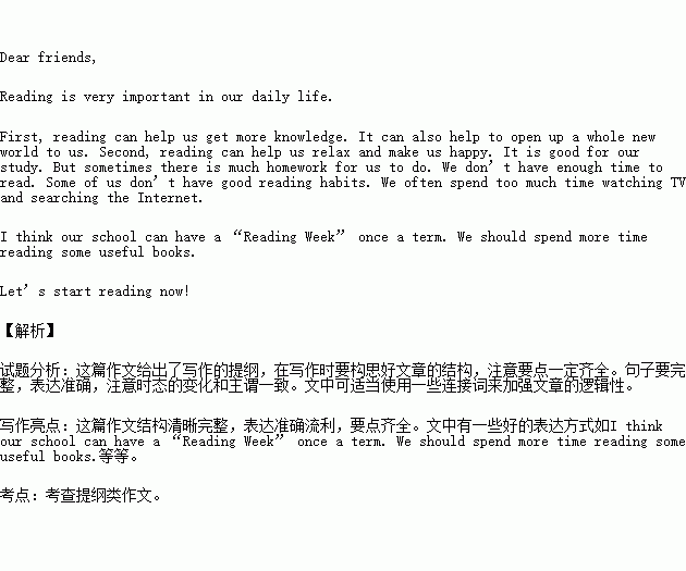 假如你校将开展“读好书,促成长”活动,请你根据这项活动的主题,向全校同学发出倡议。请参考表格内容,用英语写一份倡议书。