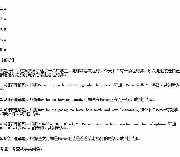 Peter is in his first grade this year. He likes to play football and watch football matches. Now he is having lunch. He is listening to music, too. He is very happy because there is going to be a great football match on TV at four this afternoon. He wants to watch it very much. But he is going to have his math and art lessons. He thinks hard and finds an idea.