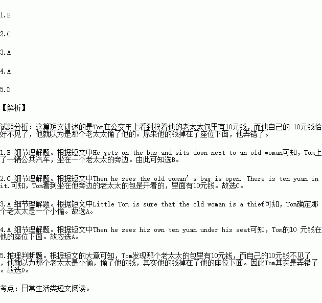Mum gives little Tom ten yuan. Then little Tom goes shopping. He gets on the bus and sits down next to an old woman. Then he sees the old woman’s bag is open. There is ten yuan in it. He quickly looks into his pocket. The money isn’t there now! Little Tom is sure that the old woman is a thief(小偷). He decides(决定)to take back the money from the old woman’s bag. So he carefully puts his hand into the old woman’s bag,takes the money and says nothing. Suddenly(突然地)the old woman shouts,“Where is my money? I can’t find it. There is a thief in the bus.” Little Tom feels strange(奇怪的). Then he sees his own ten yuan under his seat. Little Tom is thinking a question now,“Am I a thief ?”