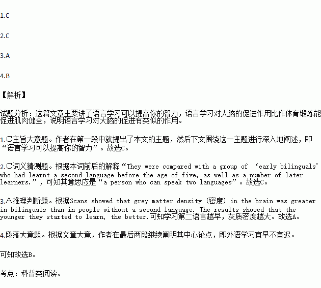 Scans showed that grey matter density (密度) in the brain was greater in bilinguals than in people without a second language. But the longer a person waited before mastering a new language, the smaller the difference.