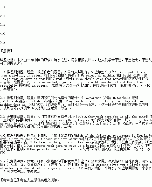 There is an old Chinese saying, “ If someone gives you a little drop of water, you should return a spring of water.” That means if someone helps you a bit, you should remember it and thank them gratefully(感激的)in return.