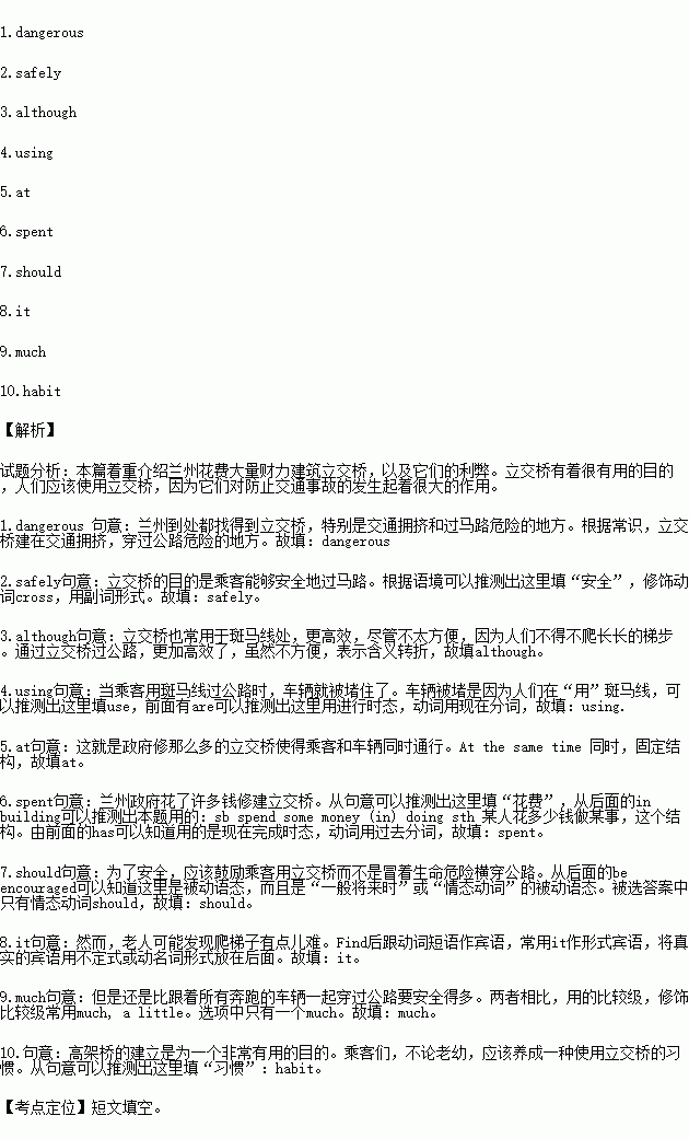 The government of Lanzhou has 6. lots of money in building these bridges. For their own safety, passengers 7. be encouraged to use them instead of risking their lives by running across the road. Old people, however, may find 8. a little difficult climbing up and down the steps, but it is still9. safer than walking across the road with all the dangerous of moving traffic.