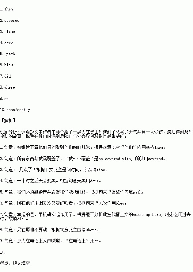 One day a group of friends climbed mountains.The snow went on falling and they could see only a few meters in front of 1. . “We should go back.” Said Judy.She was afraid.“But where is the path? Everything was 2. with snow.The sky was grey.“What’s the 3. ?” asked Paul.Judy looked at her watch.“Nearly 5 o’clock.It will get 4. in an hour. “We must continue walking and hope we find the 5. . I think the snow’s stopping.” said Paul.But it wasn’t stopping.The wind was strong.It 6. around them cold and wet.“Just keep going downhill.” Said Judy.“We can’t go wrong.Then Paul fell on some rocks.He shouted. “Judy! I’ve hurt my leg.” He couldn’t stand up. His leg hurt too much.“I’ll have to phone for help.” said Judy, “I hope the mobile phone works up here!” Luckily, it 7. .They phoned the mountain service.“Don’t move.Stay 8. you are.We are sending a team there.” shouted the man 9. the phone.They were not far from the path. So the team found them 10. .They were lucky! People often get into trouble when they climb mountains.You must always tell someone where you are going and take a mobile phone with you.