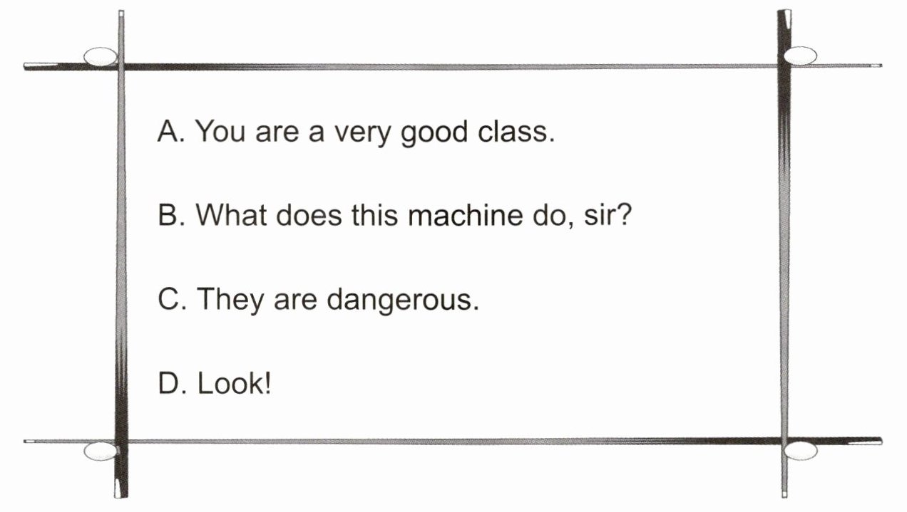第四个空格,工人A说“Wait!”,然后应该是对学生们的表现表示赞扬,并作为给予他们薯片的过渡,选项A“You are a very good class.”符合语境。