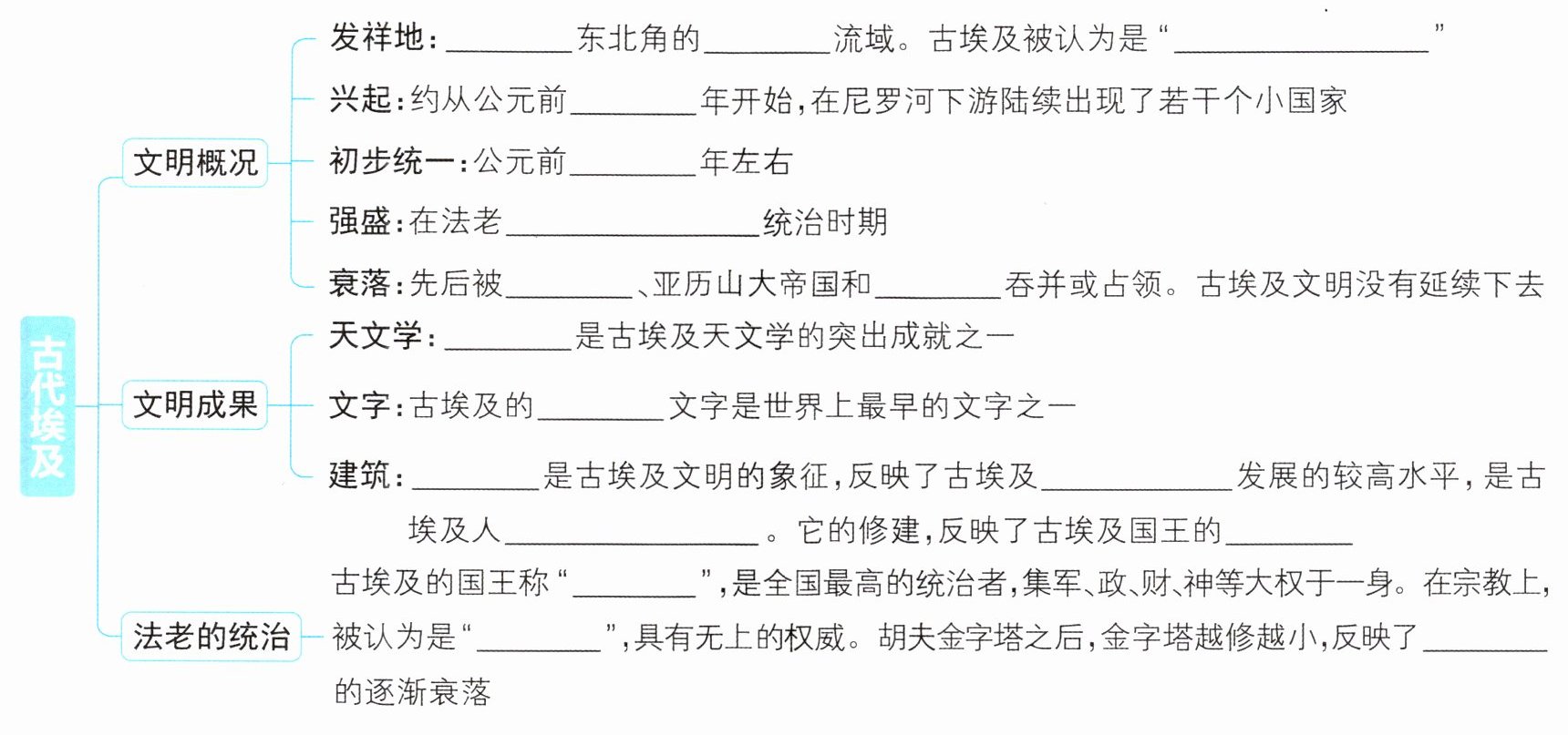 本题主要考查古代埃及的相关史实,涉及古代埃及的发祥地、兴起时间、初步统一时间、强盛时期、衰落情况、文明成果以及法老的统治等内容,属于历史基础知识的考查,需要对教材相关知识点进行准确记忆和填写。