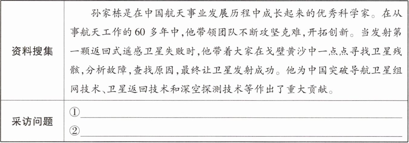 (4)围绕“君子自强不息”的学习主题,根据表中“资料搜集”,设计两个问题,采访航天科学家孙家栋。