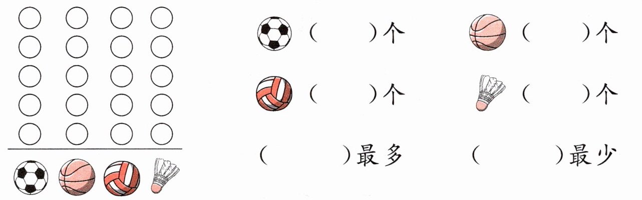 1. 按球的种类分一分,再涂一涂、填一填。