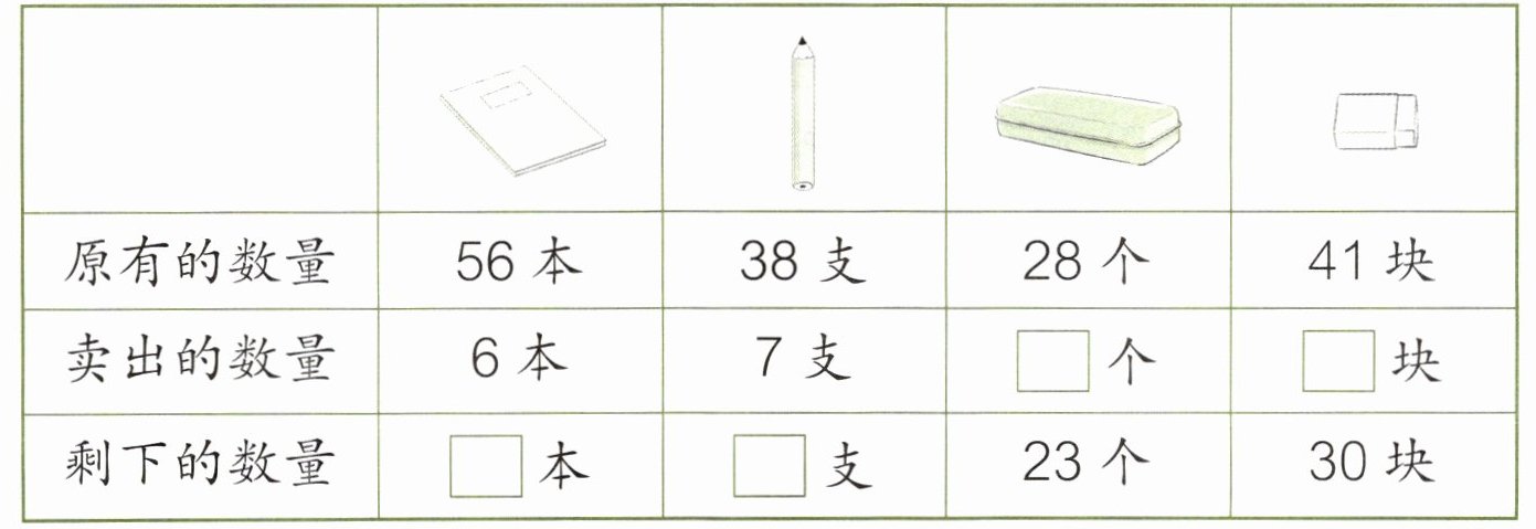 文具盒原有$28$个,剩下$23$个,卖出的数量为:$28 - 23 = 5$(个);