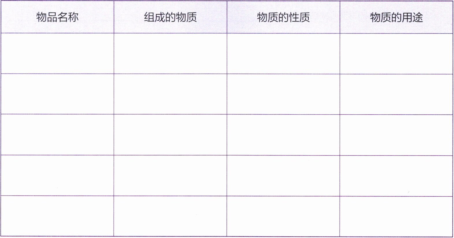 |物品名称|组成的物质|物质的性质|物质的用途|