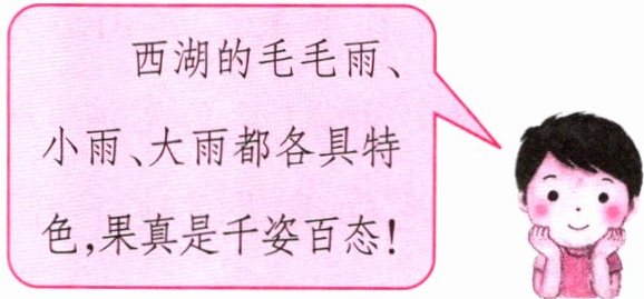 1. 西湖的毛毛细雨、小雨和大雨分别有什么特点?找出相应的句子读一读。