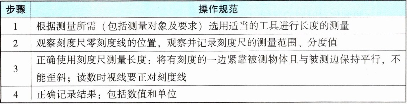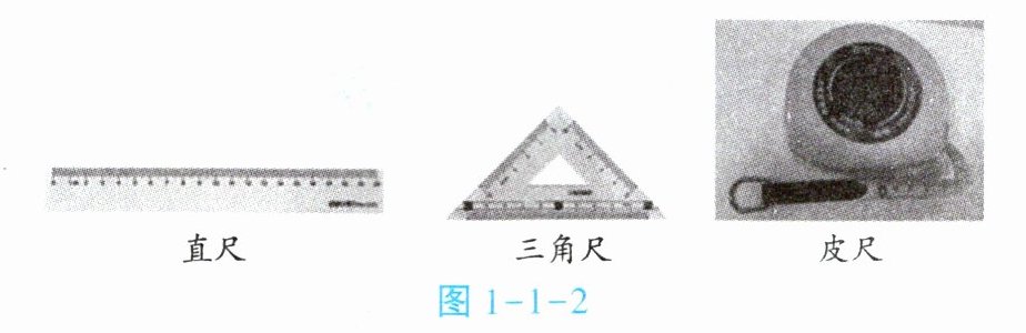 2. 请阅读课本第12~13页“长度的测量”和下面“长度测量的实验操作规范”表格,在图1-1-2中选择合适的测量工具,动手测量自己一拃的长度,并做好记录。