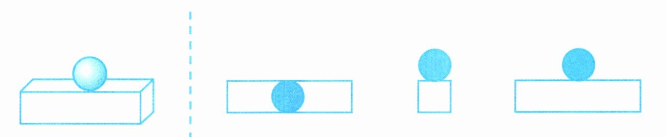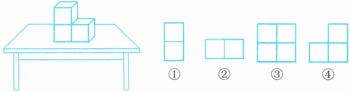 1. 下面右边的3幅图分别是从什么方向(前面、上面、左面)观察得到的?填一填。