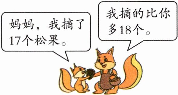 答案:解析:本题考查加法的实际应用。通过图片可知,小松鼠摘了$17$个松果,松鼠妈妈比小松鼠多摘了$18$个,要求松鼠妈妈摘的松果数,只需要用小松鼠摘的松果数加上$18$即可。