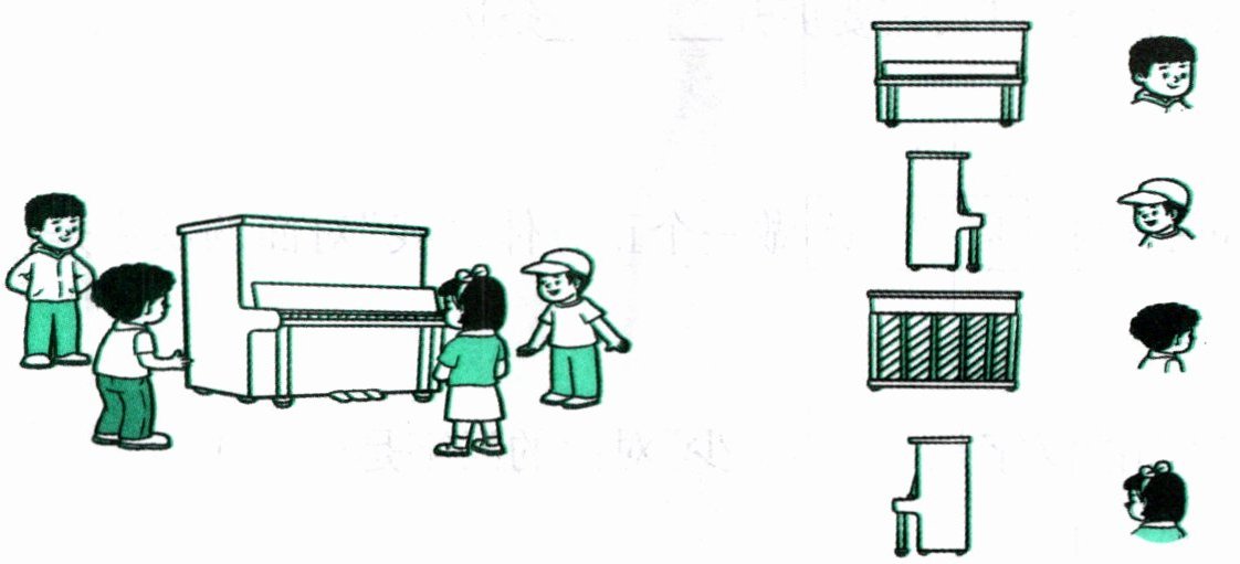 从不同角度观察到钢琴的形状不同,左侧的男孩看到的是钢琴的侧面,琴身朝向他的方向;右侧戴帽子的男孩看到的也是钢琴的侧面,但是琴身朝向与左侧男孩看到的方向相反;穿裙子的女孩看到的是钢琴的正面;另一个女孩看到的是钢琴的后面。