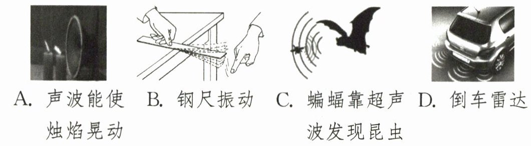 B选项,钢尺振动会发声,这个现象主要说明了声音是由物体的振动产生的,并没有直接体现声音具有能量,所以B选项不符合题意。