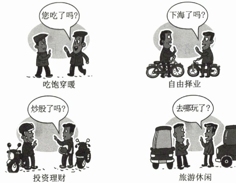 D选项:从“吃饱穿暖”到“自由择业”“投资理财”“旅游休闲”等问候语的变化,体现了随着发展,民生福祉不断增进,人民生活水平显著提高,该选项符合题意。