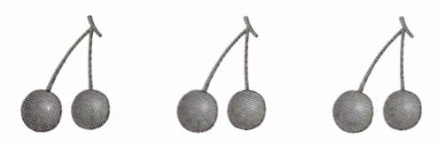 插图1有3串樱桃,每串2个,即3个2相加,算式为2+2+2=6;插图2有2只手,每只手5根手指,即2个5相加,算式为5+5=10。
