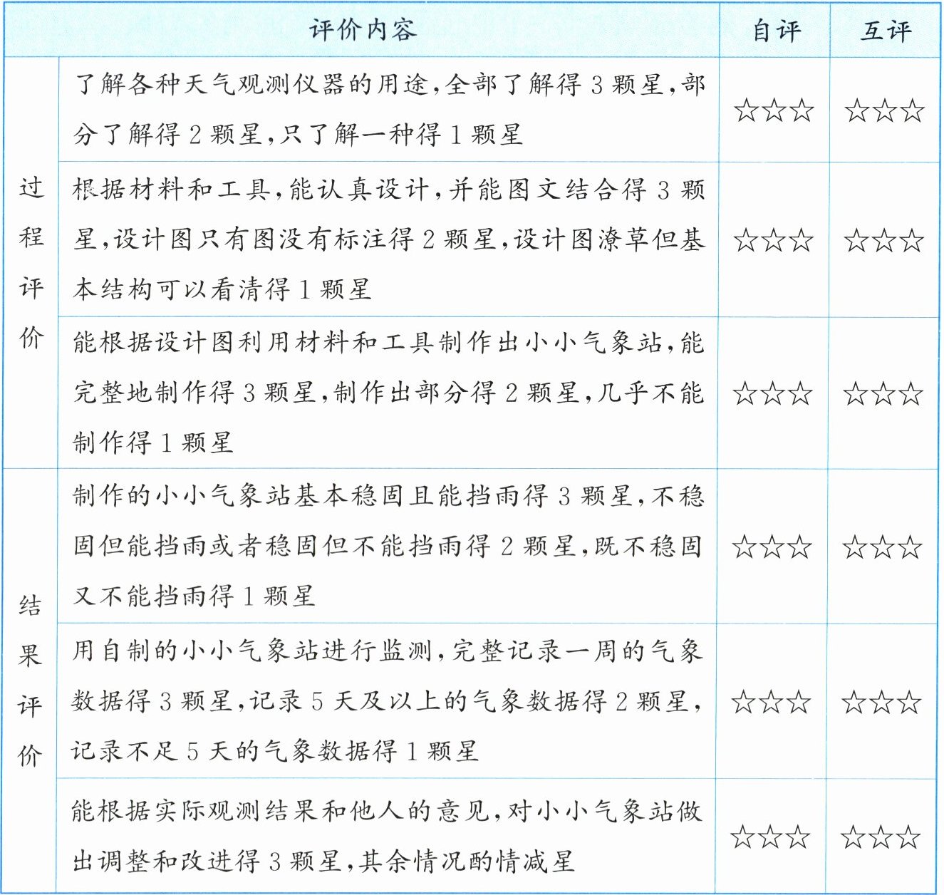 |制作的小小气象站基本稳固且能挡雨得3颗星,不稳固但能挡雨或者稳固但不能挡雨得2颗星,既不稳固又不能挡雨得1颗星|☆☆☆|☆☆☆|