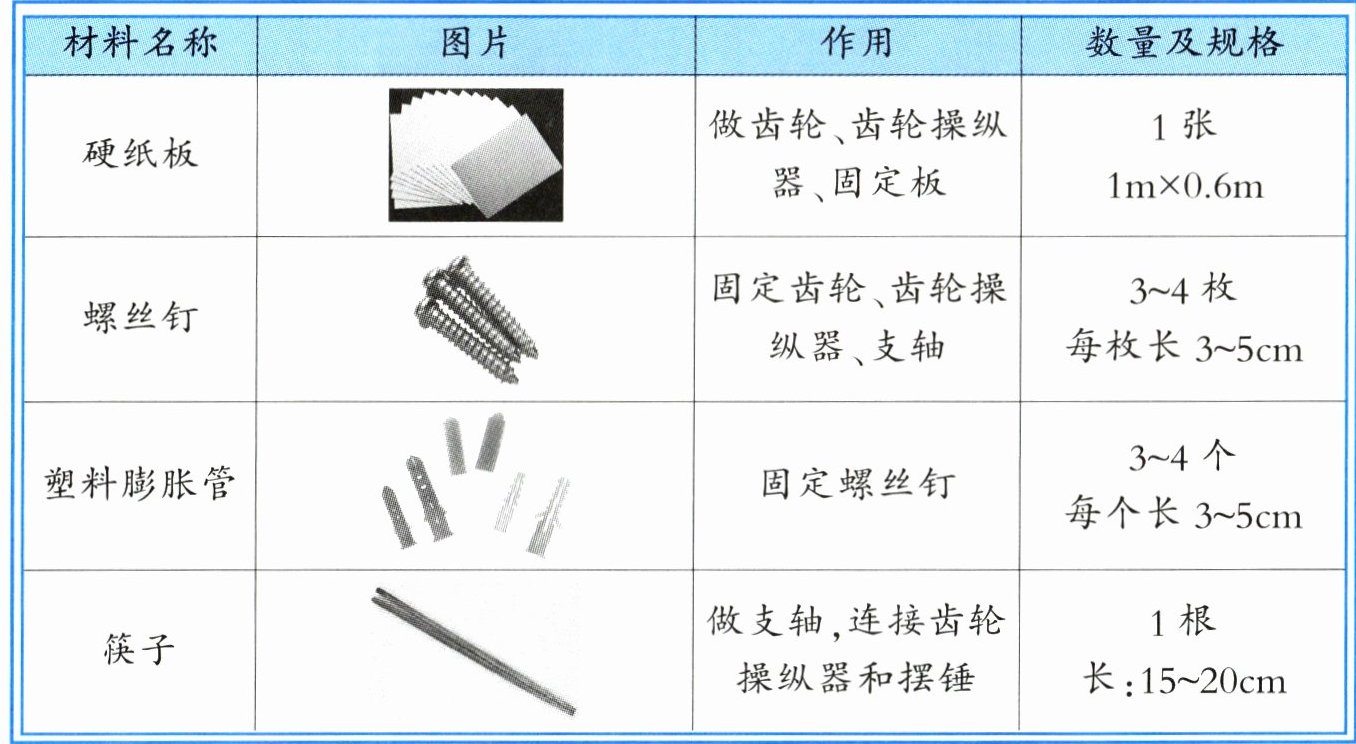 |筷子||做支轴,连接齿轮操纵器和摆锤|1 根长:15~20cm|