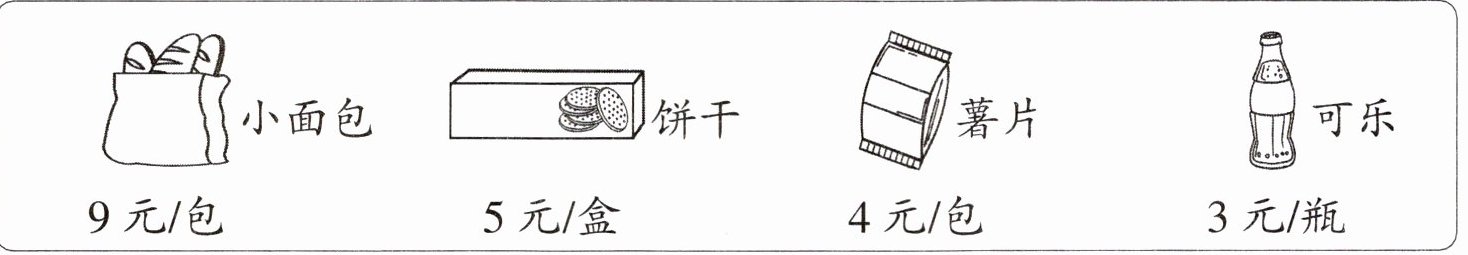 $\begin{array}{|c|c|c|c|}\hline\includegraphics[width= 0.1\textwidth]{small_bread.png} & \includegraphics[width= 0.1\textwidth]{biscuit.png} & \includegraphics[width= 0.1\textwidth]{chips.png} & \includegraphics[width= 0.1\textwidth]{cola.png} \\\hline小面包 & 饼干 & 薯片 & 可乐 \\\hline9元/包 & 5元/盒 & 4元/包 & 3元/瓶 \\\hline\end{array}\\\hline $
