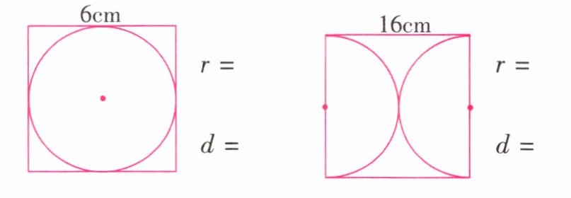 第一个图:圆的直径等于正方形边长6cm,半径r=6÷2=3cm,d=6cm;第二个图:两个半圆直径和等于正方形边长16cm,一个半圆直径d=16cm,半径r=16÷2=8cm;第三个图:小圆直径2cm,大圆半径等于小圆直径2cm,直径d=2×2=4cm。