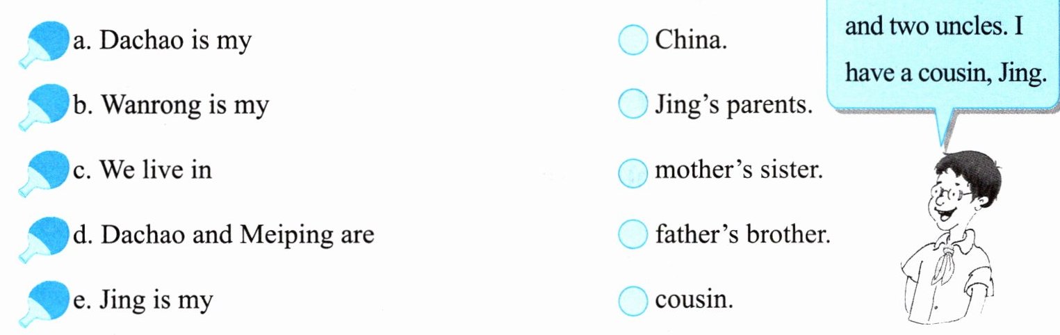 根据课文内容及家庭关系词汇匹配:a. Dachao对应父亲的兄弟(father's brother);b. Wanrong对应母亲的姐妹(mother's sister);c. live in后接地点China;d. Dachao和Meiping是Jing的父母(Jing's parents);e. Jing是堂姐妹(cousin)。