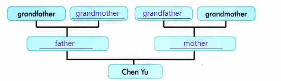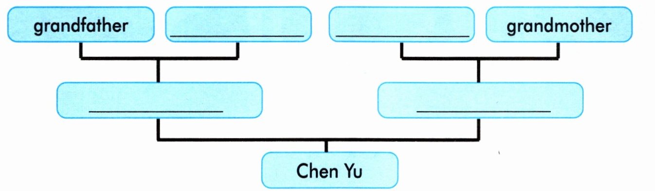 答案:a- father's brother; b- mother's sister; c- China; d- Jing's parents; e- cousin
